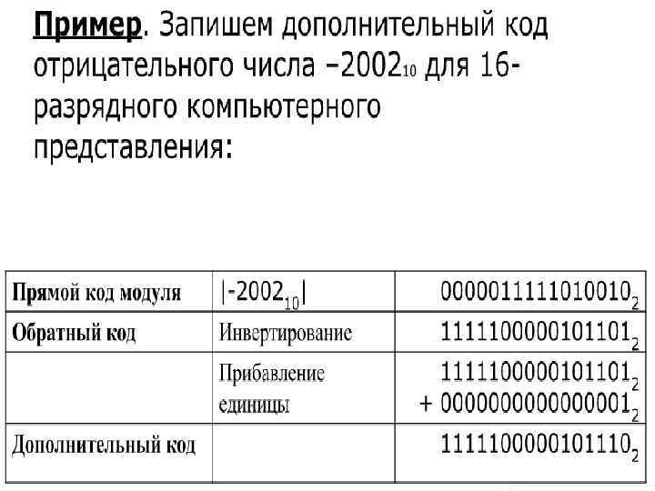 Отрицательные числа Для представления отрицательных чисел используется дополнительный код. Дополнительный код позволяет заменить арифметическую операцию вычитания операцией сложения, что существенно упрощает работу процессора и увеличивает его быстродействие.