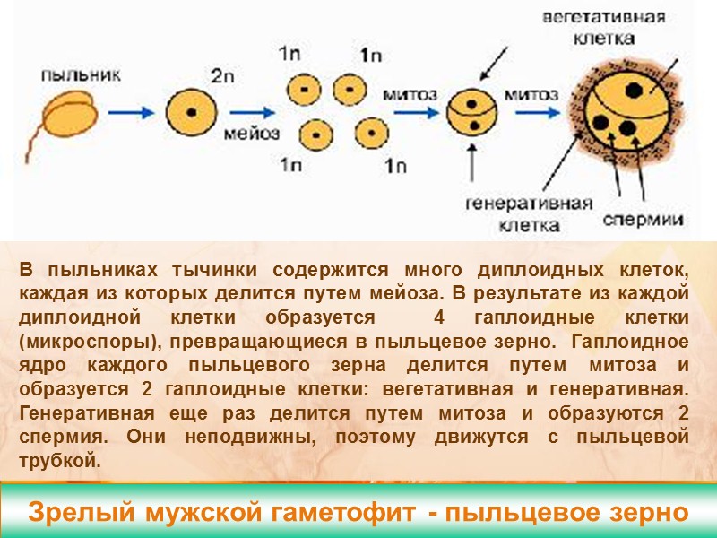 Зрелый мужской гаметофит - пыльцевое зерно Формирование спермиев В пыльниках тычинки содержится много диплоидных клеток, каждая из которых делится путем мейоза. В результате из каждой диплоидной клетки образуется 4 гаплоидные клетки (микроспоры), превращающиеся в пыльцевое зерно. Гаплоидное ядро каждого пыльцевого зерна делится путем митоза и образуется 2 гаплоидные клетки: вегетативная и генеративная. Генеративная еще раз делится путем митоза и образуются 2 спермия. Они неподвижны, поэтому движутся с пыльцевой трубкой.