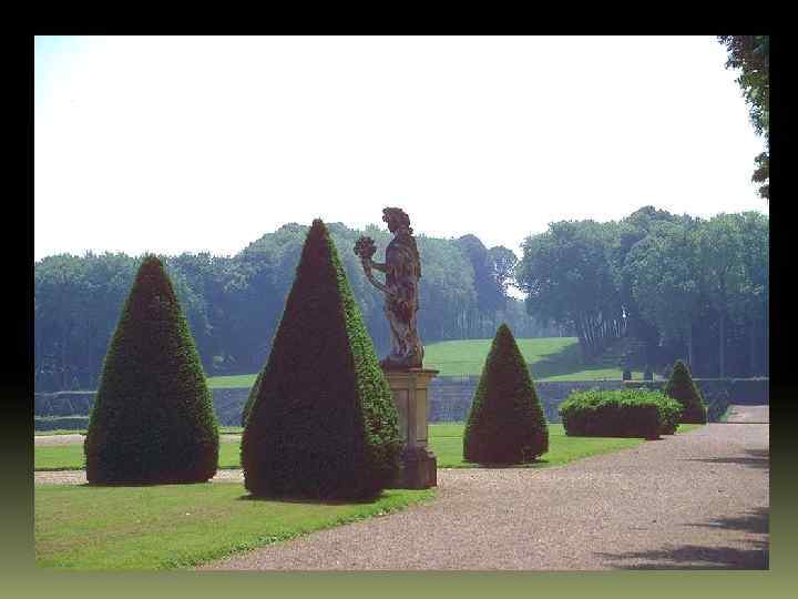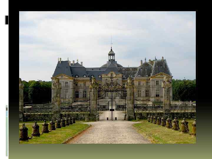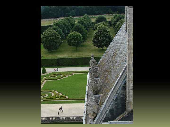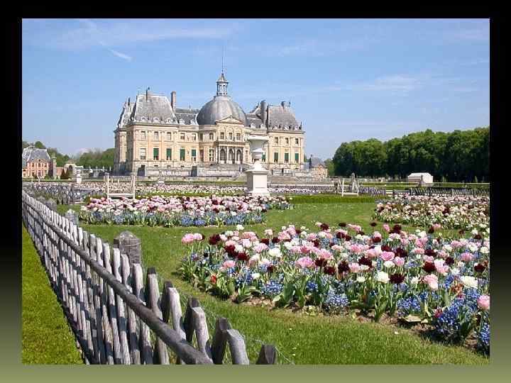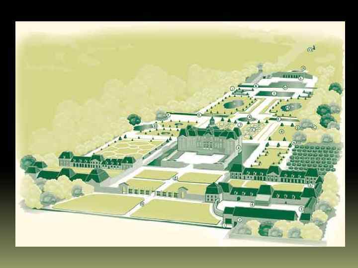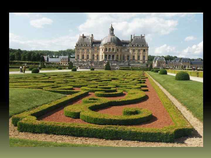 ДВОРЦОВО-ПАРКОВЫЙ АНСАМБЛЬ ВО-ЛЕ-ВИКОНТ Во-ле-Виконт – один из первых шедевров дворцово-паркового строительства Андре Ленотра, мастера классического французского сада. В содружестве с архитекторами Луи Лево и Шарлем Лебреном, он в 1656 году создал великолепный парк для министра финансов Людовика XIV Николя Фуке. В планировке этого ансамбля ярко выражены основополагающие черты французского регулярного парка. Во-первых, это главная ось, являющаяся центром симметрии всей композиции. Среднюю треть оси занимает смысловой центр - замок и регулярные сады. Периферия ансамбля занята лесопарком.