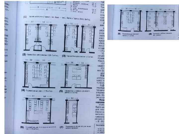 • • . Схемы планировки помещений для занятий I - классы прикладного искусства (а - ткацкий кружок на 8 чел. ; б - ткацкий кружок на 18 чел, в - керамическая мастерская на 8 чел; г - скульптурная мастерская на 8 чел. ; д - кружок моделирования сельхозтехники на 14 чел. ; 1 - стол рабочий; 2 - стол руководителя; 3 - стол складируемый; 4 - стул складируемый; 5 - стул; 6 - табурет винтовой; 7 - ткацкий станок горизонтальный; 8 - ткацкий станок вертикальный: 9 - простая перемотка ниток; 10 - шпулерная; 11 - барабан навивки основы; 12 - встроенный шкаф; 13 - раковина с отстойниками; 14 - замочка глины; 15 - хранение глины; 16 - склад для хранения гипса; 17 - станок для скульптуры; 18 - вращающийся стол для модели; 19 - место дли заводки гипса; 20 - шаровая мельница; 21 - гончарный круг; 22 – тумба - подставка для модели; 23 - электропечь; 24 - трансформатор; 25 - терморегулятор; 26 - подставка под станок; 27 - стеллаж открытый; 28 - токарно-винторезный станок; 29 - верстак слесарный; 30 - станок токарный по дереву; 31 - верстак столярный; 32 - экран и классная доска; 33 -вытяжной шкаф); II - классы ИЗО (е - занятия рисунком на 15 чел. ; ж - занятия живописью на 20 чел. ; 1 - табурет винтовой; 2 -стул; 3 – табурет; 4 – мольберт низкий; 5 - мольберт высокий; 6 - стол руководителя; 7 – стенд навесной; 8 - зеркало; 9 - подставка для натюрморта; 10 - шкаф-стеллаж встроенный; 11 -клееварка; 12 - урна; 13 - подставка для натурщика; 14 - подставка для моделей; 15 - стол складируемый; 16 - шторы)