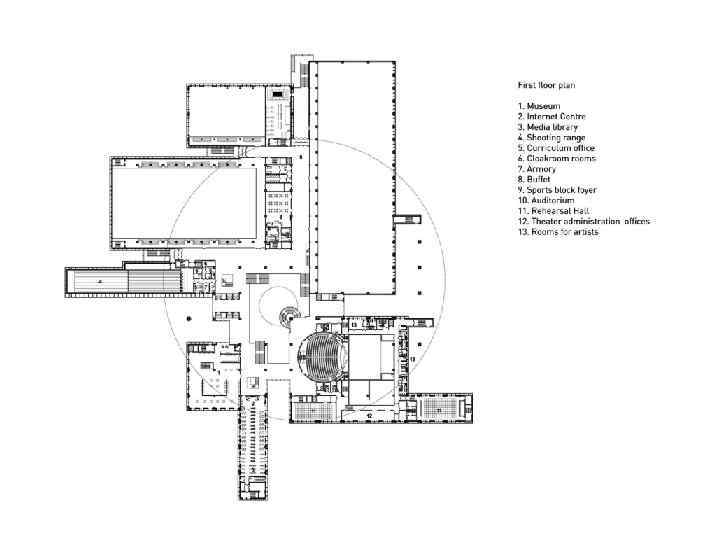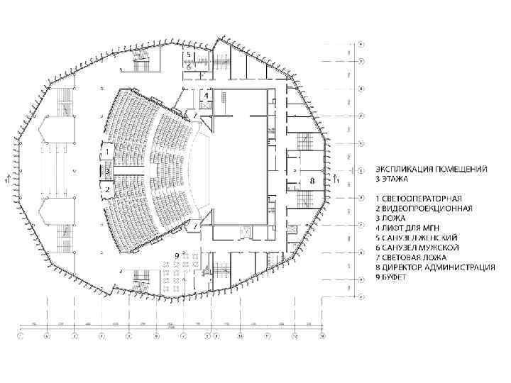Зрительский комплекс: - фойе - зрительный зал - эстрада -склад декораций и мебели - артистические ( 2 комнаты) -кино-свето-звукоаппаратная -Гардероб -репетиционные залы резервные склады; служебный вход с помещениями диспетчерской и охраны