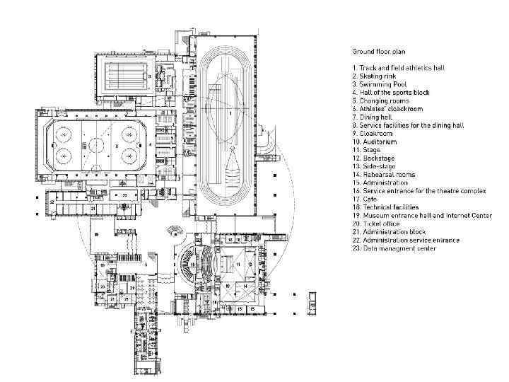 Спортивный комплекс - вестибюль с гардеробом - спортзалы, бассейны - инвентарные - раздевалки, душевые - тренерские, тренажерные - Складские помещения
