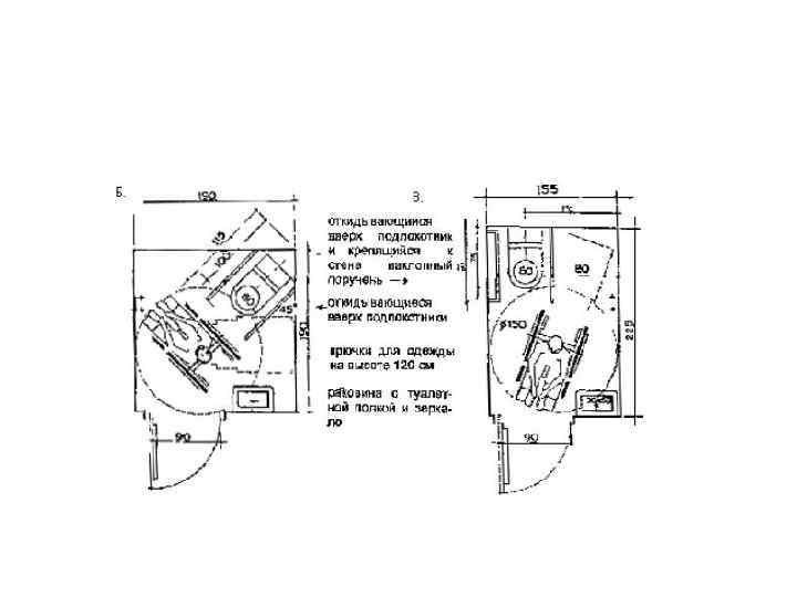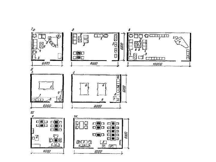 • I - репетиционный зал с эстрадой (1 - эстрада; 2 - стулья; 3 - стол руководителя); • II - помещения танцевальных коллективов (а - репетиционный зал на 24 чел. ; б - то же, на 16 чел ; 1 - станок; 2 - зеркало; 3 - музыкальный инструмент; 4 - табурет). III - кабинет политпросвещения и передового опыта (в - на 15 чел. ; г - на 25 чел. ; 1 - стол одноместный; 2 - стол двухместный; 3 - стол руководителя; 4 - стол для газет; 5 - меловая доска; 6 - переносная меловая доска; 7 - выставочная витрина; 8 - стенд напольный; 9 - стенд выставочный; 10 - встроенный шкаф); IV - кабинет культуры быта (д - на 12 чел. для занятий кружков кройки и шитья, вязания; е - на 18 чел. для теоретических занятий кружков кройки и шитья, вязания, домоводства; 1 - стол рабочий; 2 - стол обеденный, раздвижной; 3 - стол руководителя: 4 - гладильный стол; 5 - вязальная машина; 6 - стул; 7 - кресло; 8 - табурет; 9 - доска меловая; 10 - встроенный шкаф; 11 - швейная машина; 12 - стенд; 13 - манекен; 14 - зеркало; 15 - плитка электрическая; 16 - кухонный стол с мойкой)