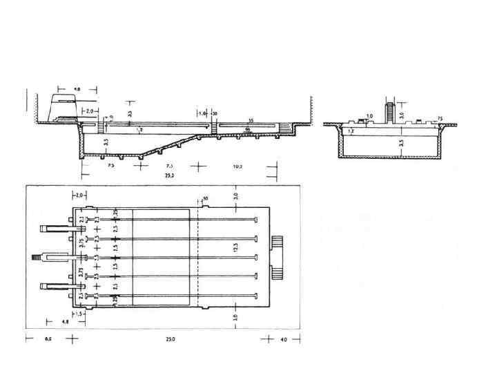 Размеры ванны для соревнований: ПЛАВАТЕЛЬНЫЕ БАССЕЙНЫ ДЛЯ СПОРТИВНЫХ СОРЕВНОВАНИЙ • Бассейны для плавания — глубина ванны 1, 8 — 2, 2 м. Бассейны для плавания и прыжков в воду — глубина ванны от 1, 8 до 4, 5 м (у вышек). • Размеры ванны для соревнований: Общая длина (м) при числе дорожек Длина, м 25; 33; 50 5 6 6 7 8 8 – 9 8 – 10 12, 5 15 16, 66 18, 5 20 22, 5 25 Водное поло. Размеры бассейна для международных соревнований 20 х 30 м, глубина 1, 8 м; в некоторых случаях — ванна 16, 66 х 25 м. В бассейнах длиной 25 м ванна для игры 12, 5 х 20 м, глубина ≥ 1, 05 м.