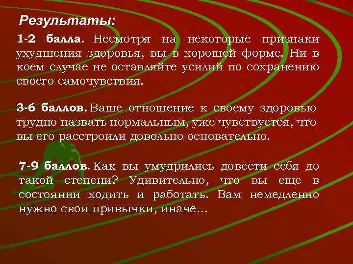 Результаты: 1 -2 балла. Несмотря на некоторые признаки ухудшения здоровья, вы в хорошей форме. Ни в коем случае не оставляйте усилий по сохранению своего самочувствия. 3 -6 баллов. Ваше отношение к своему здоровью трудно назвать нормальным, уже чувствуется, что вы его расстроили довольно основательно. 7 -9 баллов. Как вы умудрились довести себя до такой степени? Удивительно, что вы еще в состоянии ходить и работать. Вам немедленно нужно свои привычки, иначе…