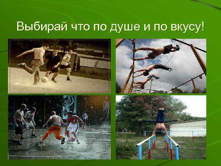 Что такое дворовый спорт? Дворовый спорт – этим выражением принято называть совокупность занятий на турниках, брусьях, отжимания, упражнения на пресс и другое. Так же эту категорию совсем чуть-чуть затрагивают: паркур, мини-футбол, стрит, скейт, bmx и т. д. Вообщем это все виды спорта, которыми можно заниматься сразу же, как вышел из дома во двор : ) Можно так же сказать, что дворовый спорт – это разновидность фитнеса. За это тебе не нужно платить, главное желание и заинтересованность.