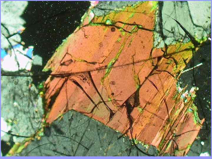 Аномальные цвета интерференции С краю минерала, в случае нормальных цветов интерференции желтый цвет первого порядка должен сменятся белым, здесь из под желтого выглядывает синий. Мелилит.