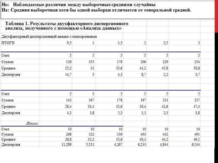 ДВУХФАКТОРНЫЙ ДИСПЕРСИОННЫЙ АНАЛИЗ Нулевая и альтернативная гипотезы те же, что и при анализе однофакторного комплекса т. е. различия между выборочными средними случайны средняя выборочная хотя бы ОДНОЙ ВЫБОРКИ отличается от генеральной средней.