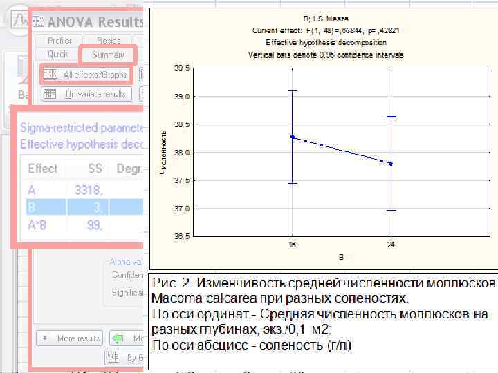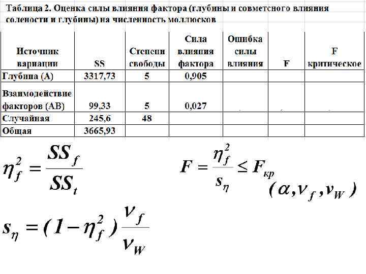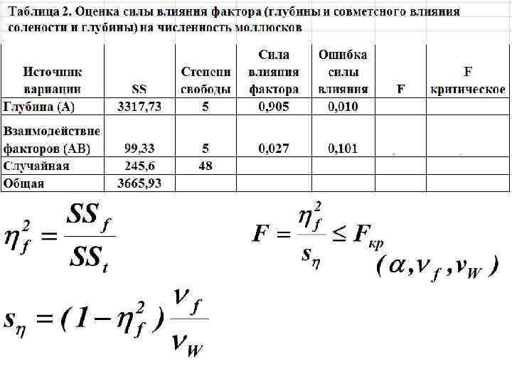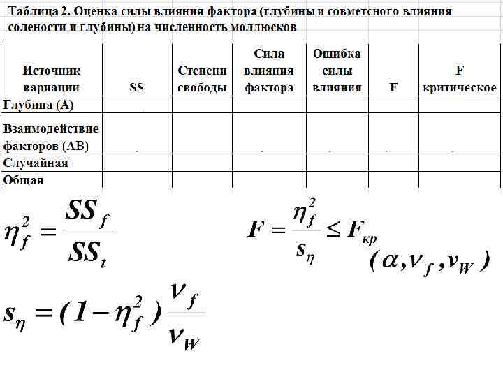 Выводы: S =SS/ν На данном уровне значимости нулевая гипотеза 2 отвергается при сравнении выборок с разных глубин и при анализе совместного влияния глубины и солености. F=S 21/S 22 Не выявлено достоверной неоднородности анализируемого комплекса, обусловленной влиянием на исследуемый признак (плотность Fst (α; ν 1; ν 2) моллюсков) солености.