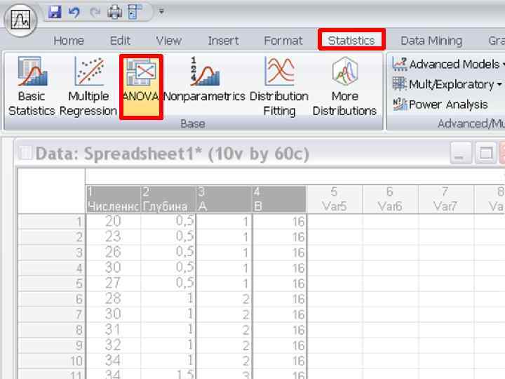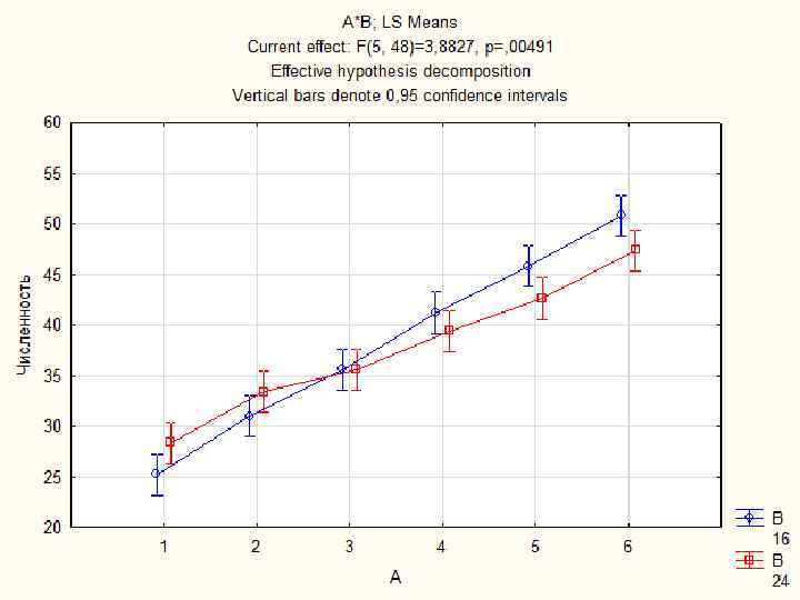 ПРИМЕР. Изучалось влияние солености и глубины на распределение плотности моллюсков Macoma calcarea. Для этого в акватории с соленостью 16 г/л на 6 станциях на глубинах от 0. 5 до 3 м взяли по 5 выборочных площадок площадью 0. 1 м 2, в каждой из которых посчитали количество моллюсков. Аналогичную съемку осуществили в акватории с соленостью 24 г/л. ДВУХФАКТОРНЫЙ ДИСПЕРСИОННЫЙ РАВНОМЕРНЫЙ КОМПЛЕКС: Объем выборки (ni) – 5 Фактор А – Глубина – 6 градаций (a) Всего 12 выборок Фактор В – Соленость – 2 градации (b)
