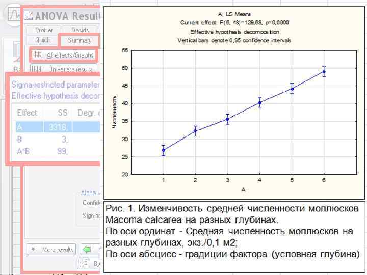 Выводы: • Уровень значимости (p) критерия Фишера в отношении фактора А (глубина) (=129, 68) меньше 0, 05 (=0, 00000), поэтому мы отвергаем нулевую гипотезу о случайности различий средних численностей моллюсков на разных глубинах, т. е. достоверно влияние глубины на распределение численности маком. • Уровень значимости (p) критерия Фишера в отношении фактора В (соленость) (=0, 64) больше 0, 05 (=0, 43), поэтому мы принимаем нулевую гипотезу о случайности различий средних численностей моллюсков при разных соленостях, т. е. недостоверно влияние солености на распределение численности маком. • Уровень значимости (p) критерия Фишера в отношении совместного влияния факторов А и В (=3, 88) меньше 0, 05 (=0, 00000), поэтому мы отвергаем нулевую гипотезу о случайности различий средних численностей моллюсков, т. е. достоверно совместное влияние факторов на распределение численности маком.