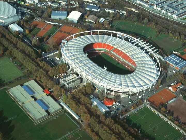 Cтадион в Штутгарте (ФРГ) Сечение 1200 × 1200 мм и 600 × 900 мм. Нижнее опорное кольцо также стальное, коробчатого профиля, сечением 900 × 900 мм. Колонны стальные, коробчатого профиля, сечением 550 × 1100, длиной от 28 до 49 м. Кровельный материал мембрана из стекловолокна с тефлоновым покрытием. Представленное конструктивное решение, обладая хорошей архитектурной выразительностью, позволяет удовлетворить функциональному назначению покрытия и иметь минимальный расход материалов.