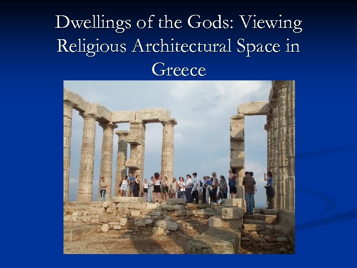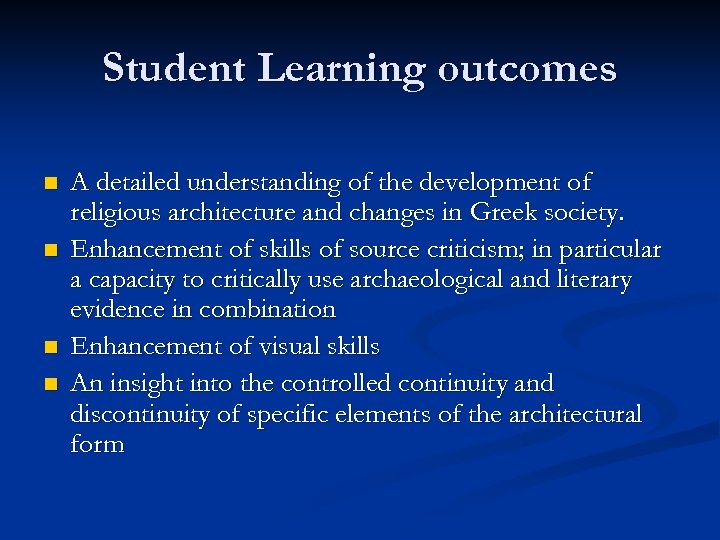 Student Learning outcomes n n A detailed understanding of the development of religious architecture and changes in Greek society. Enhancement of skills of source criticism; in particular a capacity to critically use archaeological and literary evidence in combination Enhancement of visual skills An insight into the controlled continuity and discontinuity of specific elements of the architectural form