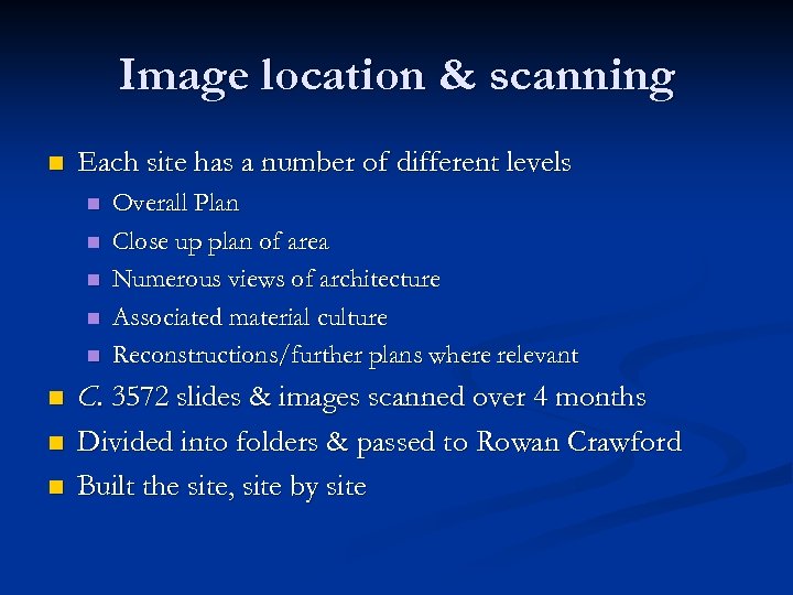 Image location & scanning n Each site has a number of different levels n n n n Overall Plan Close up plan of area Numerous views of architecture Associated material culture Reconstructions/further plans where relevant C. 3572 slides & images scanned over 4 months Divided into folders & passed to Rowan Crawford Built the site, site by site