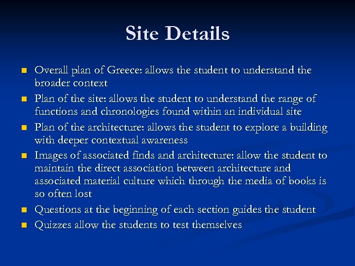 Site Details n n n Overall plan of Greece: allows the student to understand the broader context Plan of the site: allows the student to understand the range of functions and chronologies found within an individual site Plan of the architecture: allows the student to explore a building with deeper contextual awareness Images of associated finds and architecture: allow the student to maintain the direct association between architecture and associated material culture which through the media of books is so often lost Questions at the beginning of each section guides the student Quizzes allow the students to test themselves