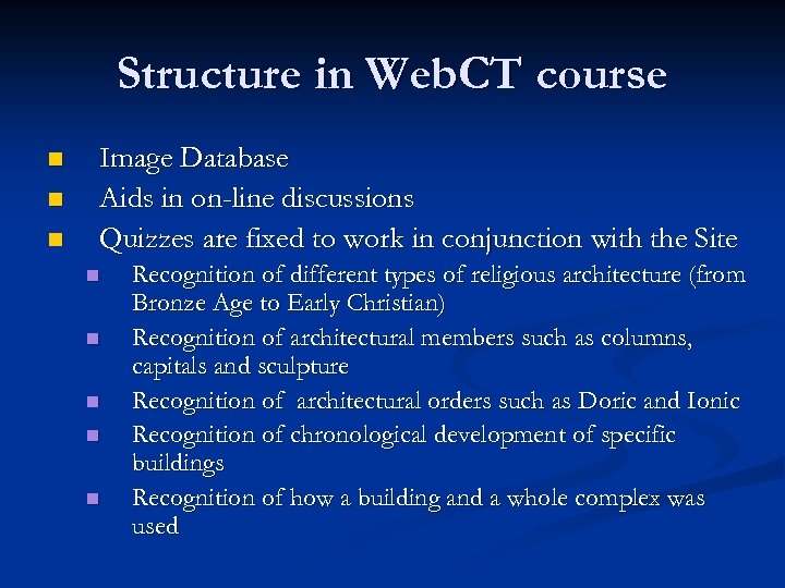 Structure in Web. CT course n n n Image Database Aids in on-line discussions Quizzes are fixed to work in conjunction with the Site n n n Recognition of different types of religious architecture (from Bronze Age to Early Christian) Recognition of architectural members such as columns, capitals and sculpture Recognition of architectural orders such as Doric and Ionic Recognition of chronological development of specific buildings Recognition of how a building and a whole complex was used