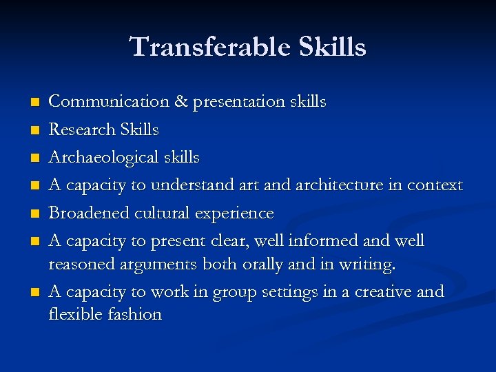 Transferable Skills n n n n Communication & presentation skills Research Skills Archaeological skills A capacity to understand art and architecture in context Broadened cultural experience A capacity to present clear, well informed and well reasoned arguments both orally and in writing. A capacity to work in group settings in a creative and flexible fashion
