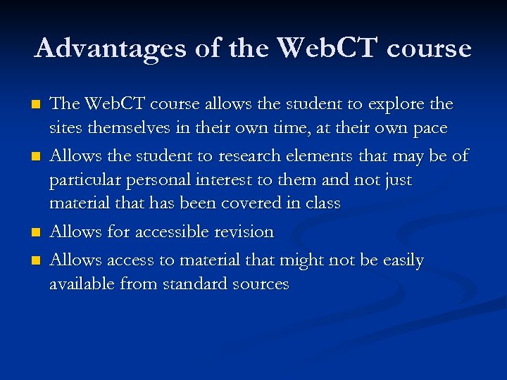 Advantages of the Web. CT course n n The Web. CT course allows the student to explore the sites themselves in their own time, at their own pace Allows the student to research elements that may be of particular personal interest to them and not just material that has been covered in class Allows for accessible revision Allows access to material that might not be easily available from standard sources