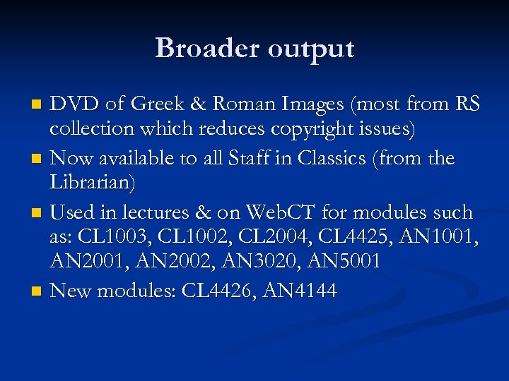 Broader output DVD of Greek & Roman Images (most from RS collection which reduces copyright issues) n Now available to all Staff in Classics (from the Librarian) n Used in lectures & on Web. CT for modules such as: CL 1003, CL 1002, CL 2004, CL 4425, AN 1001, AN 2002, AN 3020, AN 5001 n New modules: CL 4426, AN 4144 n