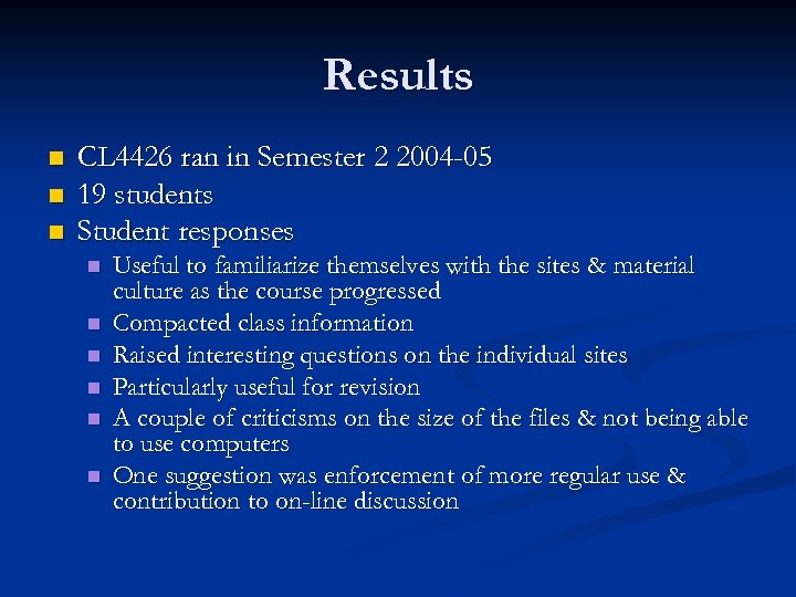 Results n n n CL 4426 ran in Semester 2 2004 -05 19 students Student responses n n n Useful to familiarize themselves with the sites & material culture as the course progressed Compacted class information Raised interesting questions on the individual sites Particularly useful for revision A couple of criticisms on the size of the files & not being able to use computers One suggestion was enforcement of more regular use & contribution to on-line discussion
