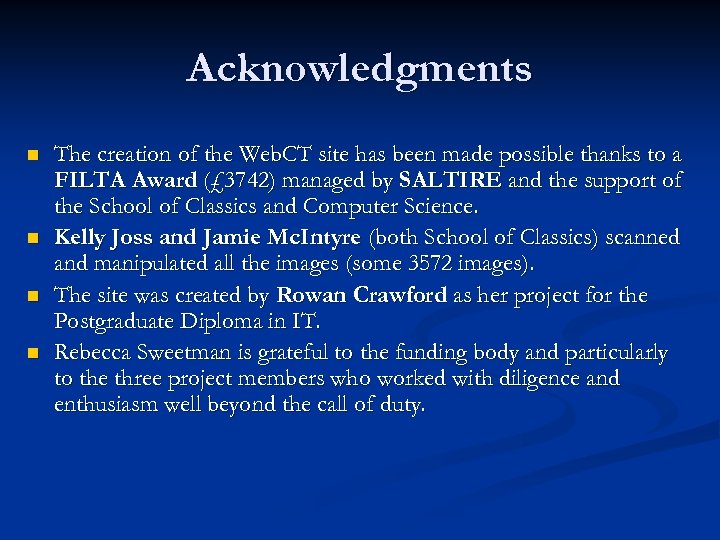 Acknowledgments n n The creation of the Web. CT site has been made possible thanks to a FILTA Award (£ 3742) managed by SALTIRE and the support of the School of Classics and Computer Science. Kelly Joss and Jamie Mc. Intyre (both School of Classics) scanned and manipulated all the images (some 3572 images). The site was created by Rowan Crawford as her project for the Postgraduate Diploma in IT. Rebecca Sweetman is grateful to the funding body and particularly to the three project members who worked with diligence and enthusiasm well beyond the call of duty.