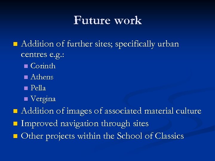 Future work n Addition of further sites; specifically urban centres e. g. : Corinth n Athens n Pella n Vergina n Addition of images of associated material culture n Improved navigation through sites n Other projects within the School of Classics n