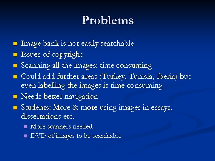 Problems n n n Image bank is not easily searchable Issues of copyright Scanning all the images: time consuming Could add further areas (Turkey, Tunisia, Iberia) but even labelling the images is time consuming Needs better navigation Students: More & more using images in essays, dissertations etc. n n More scanners needed DVD of images to be searchable