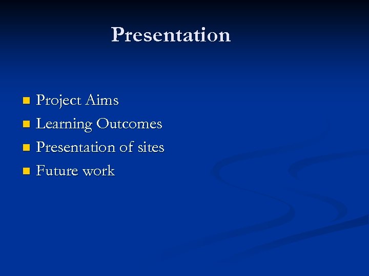 Presentation Project Aims n Learning Outcomes n Presentation of sites n Future work n