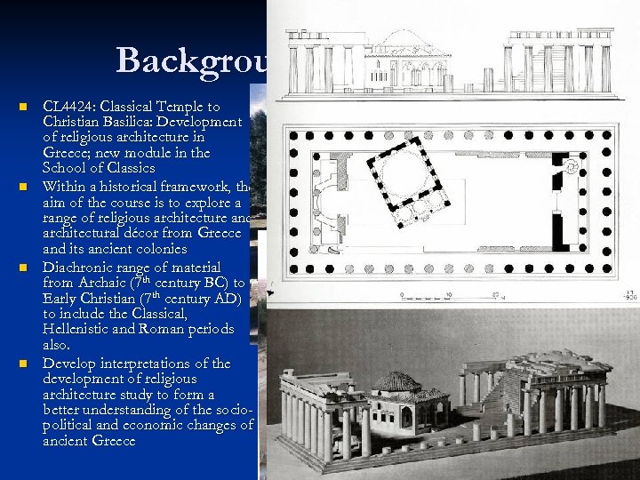 Background: the module n n CL 4424: Classical Temple to Christian Basilica: Development of religious architecture in Greece; new module in the School of Classics Within a historical framework, the aim of the course is to explore a range of religious architecture and architectural décor from Greece and its ancient colonies Diachronic range of material from Archaic (7 th century BC) to Early Christian (7 th century AD) to include the Classical, Hellenistic and Roman periods also. Develop interpretations of the development of religious architecture study to form a better understanding of the sociopolitical and economic changes of ancient Greece