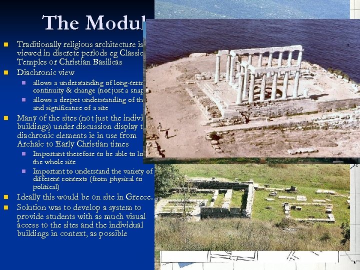 The Module n n Traditionally religious architecture is viewed in discrete periods eg Classical Temples or Christian Basilicas Diachronic view n n n Many of the sites (not just the individual buildings) under discussion display these diachronic elements ie in use from Archaic to Early Christian times n n allows a understanding of long-term continuity & change (not just a snapshot) allows a deeper understanding of the use and significance of a site Important therefore to be able to look at the whole site Important to understand the variety of different contexts (from physical to political) Ideally this would be on site in Greece…. Solution was to develop a system to provide students with as much visual access to the sites and the individual buildings in context, as possible