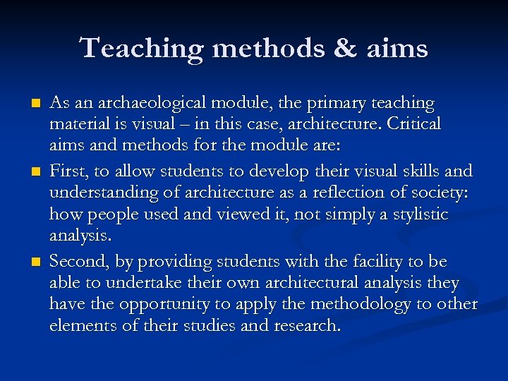 Teaching methods & aims n n n As an archaeological module, the primary teaching material is visual – in this case, architecture. Critical aims and methods for the module are: First, to allow students to develop their visual skills and understanding of architecture as a reflection of society: how people used and viewed it, not simply a stylistic analysis. Second, by providing students with the facility to be able to undertake their own architectural analysis they have the opportunity to apply the methodology to other elements of their studies and research.