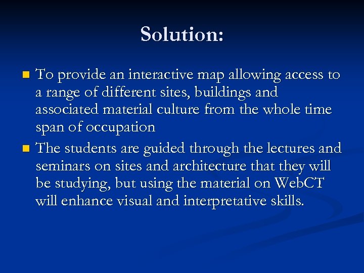Solution: To provide an interactive map allowing access to a range of different sites, buildings and associated material culture from the whole time span of occupation n The students are guided through the lectures and seminars on sites and architecture that they will be studying, but using the material on Web. CT will enhance visual and interpretative skills. n