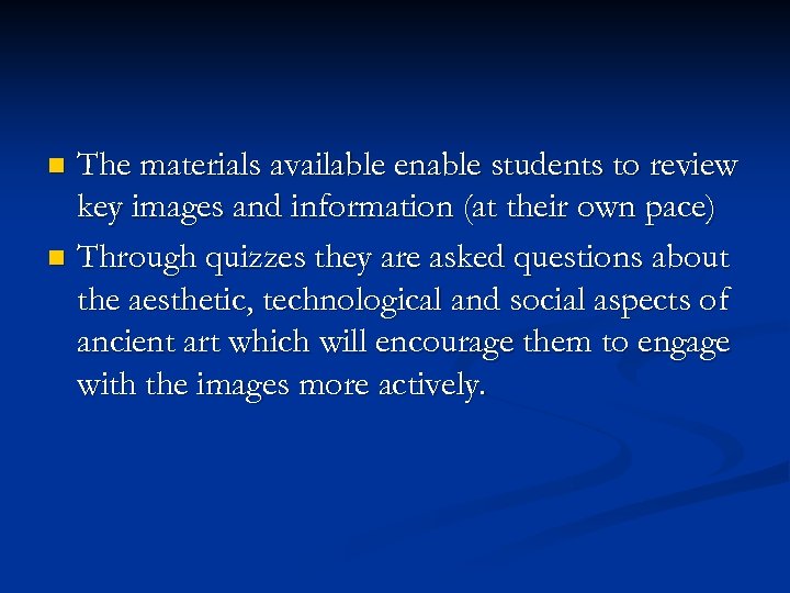 The materials available enable students to review key images and information (at their own pace) n Through quizzes they are asked questions about the aesthetic, technological and social aspects of ancient art which will encourage them to engage with the images more actively. n
