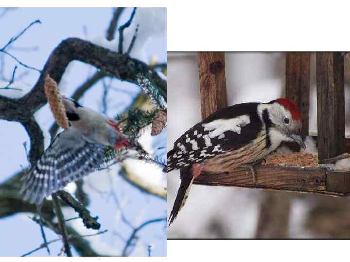 Живлення • Вибір кормів найрізноманітніший залежно від сезону з ухилом у бік тваринної або рослинної їжі. Самці і самки здобувають її на різних територіях, часто навіть у різних типах лісу. • Навесні та влітку дятли у великих кількостях поїдають усіляких комах та їхніх личинок: жуків, у тому числі тих, які харчуються деревиною (вусачів, короїдів, златок, рогачів, листоїдів, сонечок, довгоносиків, турунів), гусениць та імаго метеликів (древоточців, зубниць, вовнянок, п'ядунів, коконопрядів, рогохвостів, попелиць, кокцид. Чималу частку раціону складають мурахи. • Зрідка вживають в їжу ракоподібних і молюсків. У холодну пору року дятлів нерідко можна спостерігати біля житла людини, де вони відвідують пташині годівниці або видобувають залишки харчів (сир, ковбасу тощо) на смітниках. При нагоді живляться падлом. Крім того, відмічене розорення гнізд дрібних співочих птахів, поїдання їх яєць і пташенят. Серед жертв цього виду відмічені мухоловки строкаті, звичайні горихвістки, синиці, зяблики, кропив'янки, навіть інших видів дятлів. • Корм добувають на стовбурах і на поверхні землі.
