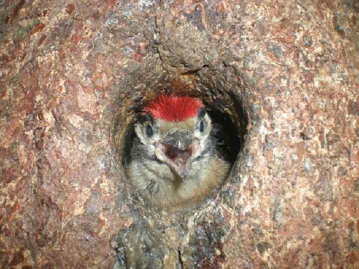Спосіб життя • Великий строкатий дятел займає певну домашню ділянку. Всю зиму самець і самка живуть порізно на своїх територіях. Площа зимових угідь дятла змінюється від 2 до 25 га, а влітку пара займає ділянку площею 460 га. Літає дятел добре і швидко, описуючи в повітрі плавну дугу: кількома помахами крил набирає висоту, а потім складає крила і по діагоналі ковзає вниз. Саме таким способом птах перелітає з дерева на дерево. Раціон дятла схожий дуже розмаїтий. Своїм міцним дзьобом він невтомно простукує стовбури дерев у пошуках різних жучків і личинок. Навесні птах часто видовбує у корі пробоїни, щоб попити свіжого соку і поживитись молодою деревиною, а на землі збирає мурах, горішки та насіння. Зірвавши з гілки шишку, дятел заклинює її в «ковадлі» - природній або видовбаній ним самим ніші, а потім методично розкриває лусочки і виїдає насіння. Влітку його дієта поповнюється метеликами і павучками, яких можна збирати прямо на корі. Здобиччю птаха часто стають білченята і пташенята дрібних лісових птахів, а в кінці літа дятел охоче ласує медом і насінням соняшника. Взимку його раціон складається тільки з рослинної їжі. Спілкуються дятли на мові голосових сигналів і стуком по сухій гілці. Для кожного повідомлення у птахів існує свій набір «слів» .