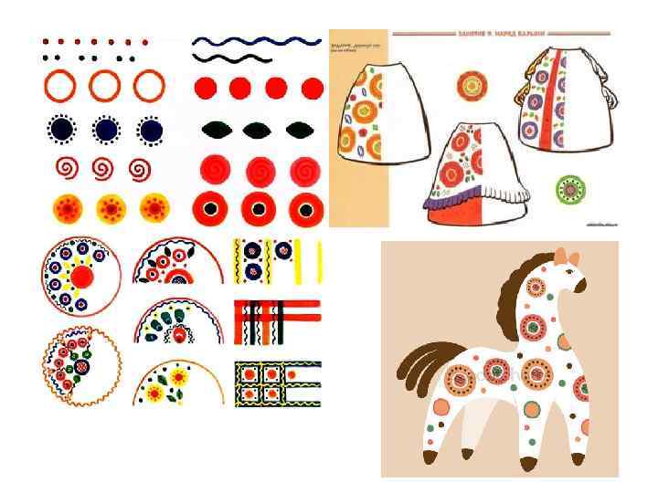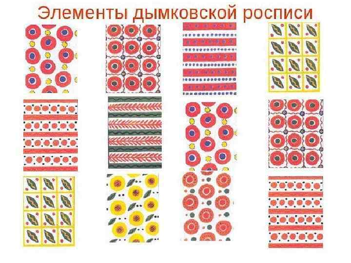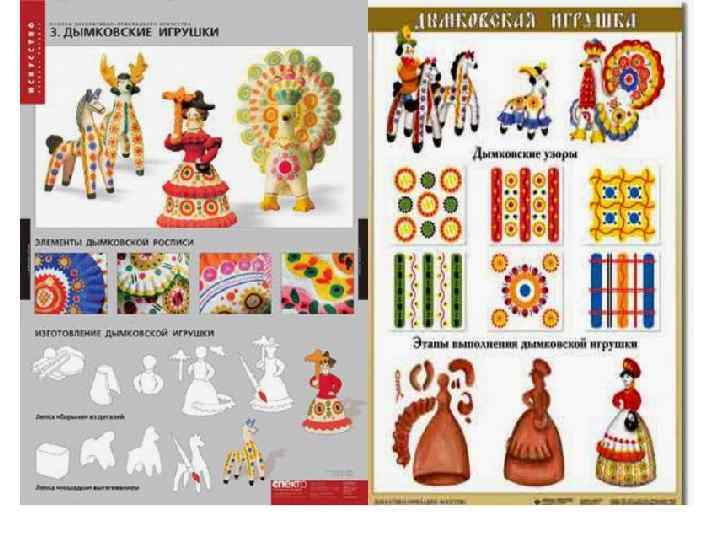 Дымковская игрушка русский народный художественный промысел; издавна существует в слободе Дымково (ныне на территории города Киров). Дымковскую игрушку лепят из глины, обжигают и по грунту раскрашивают темперой, включают сусальное золото. Изображает животных, всадников, дам в кринолинах, сказочные, бытовые сцены. Художественное своеобразие. В образах краснощeких барынь, кормилиц, лихих всадников, сценах чаепитий, ярмарочных гуляний, весeлых каруселях продолжают жить трeхсотлетние традиции дымковского искусства, бережно сохраняется архаика древних образцов. Роспись дымковской игрушки нарядна и декоративна. На белом фоне очень ярко сверкают малиновый, синий, зелeный, жeлто-оранжевый цвета.