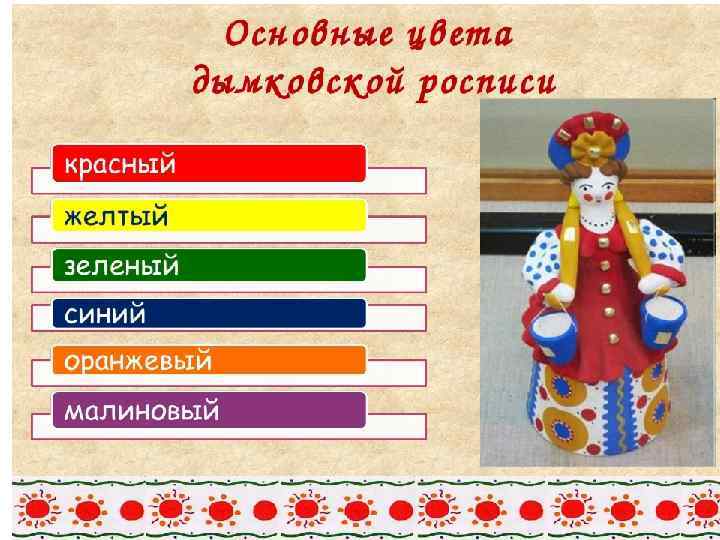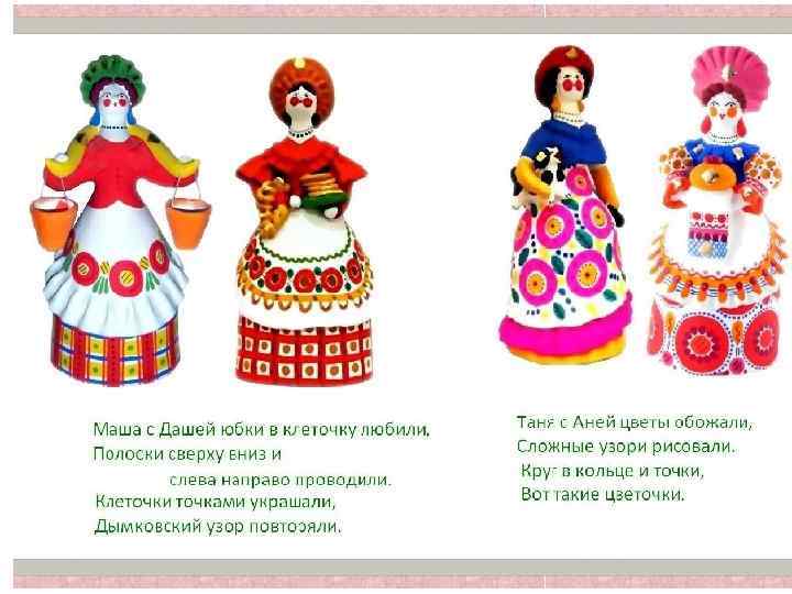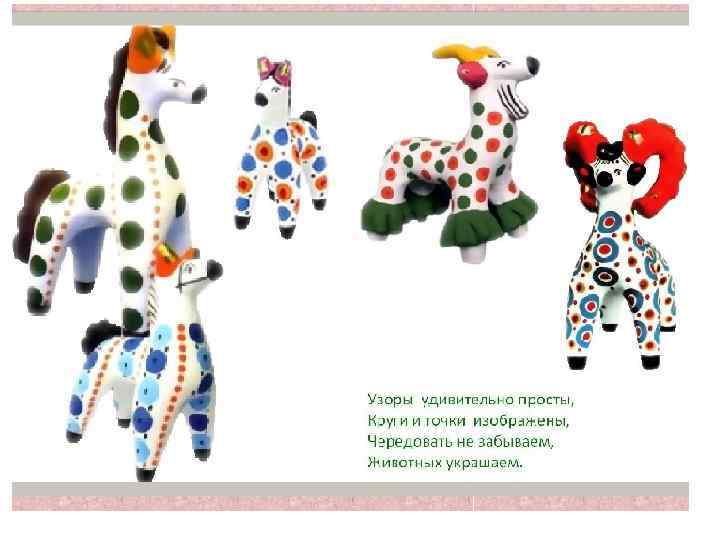 «Дымковская игрушка» «Чем знаменито Дымково? Игрушкою своей! В ней нету цвету дымного, Что серости серей. В ней что-то есть от радуги, От капелек росы, В ней что-то есть от радости, Гремящей, как басы!» (В. Фофанов