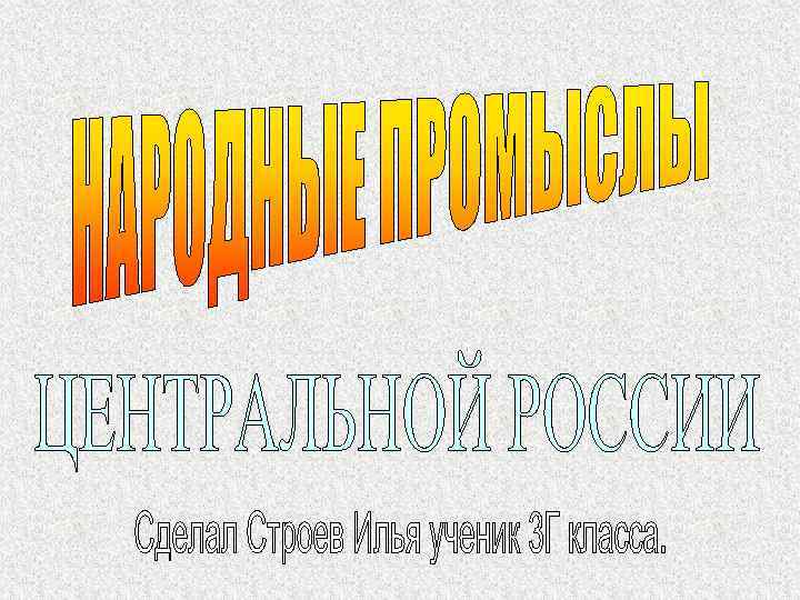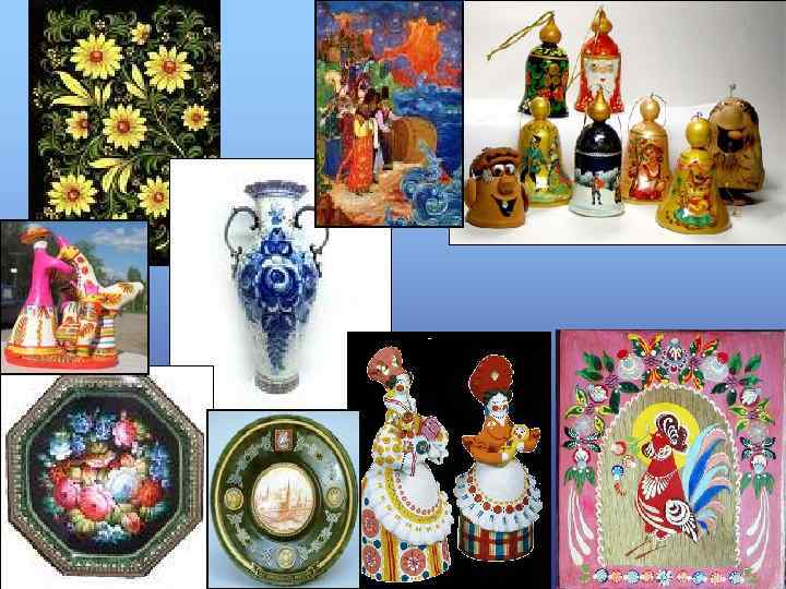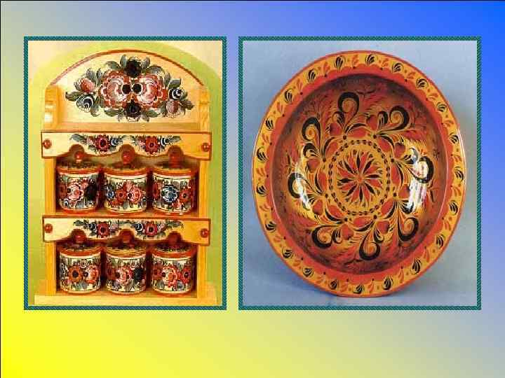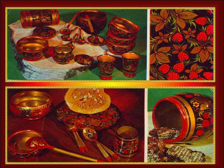ХОХЛОМА Горьковская область - родина искусства золотой росписи. Происхождение промысла связано с торговым селом Хохломой в 17 -19 веках. Особенность этих изделий – живописность ярких сочных полевых трав, ягод, цветов, простота и непосредственность рисунка. Характерна для росписи «травка» , орнамент с ягодами земляники, рябины, крыжовника. Ассортимент предметов включает настенные панно, тарелки и блюда, вазы, различные бочонки, коробочки, солоницы, рюмки, ложкарные изделия и другое.
