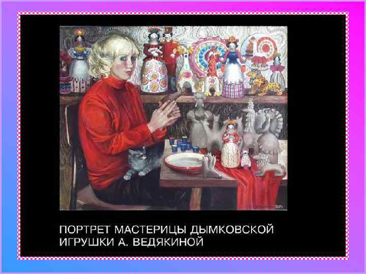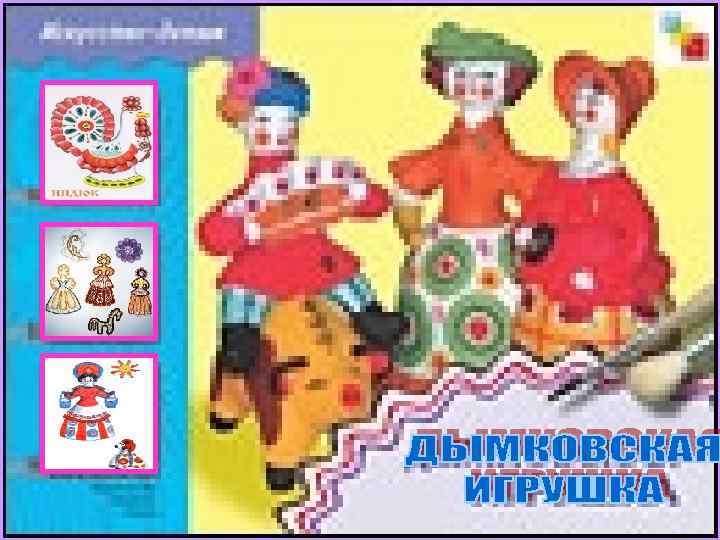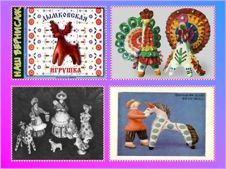 ДЫМКОВСКАЯ ИГРУШКА Дымковская, или вятская, игрушка – известный вид русского народного искусства. Он зародился в Дымковской слободе (близ г. Вятки – ныне Киров). Для дымковской игрушки характерен простой геометрический орнамент из ярких пятен, кругов, зигзагов и полос. Для раски применяют контрастные сочетания ярких цветов – красного, малинового, желтого, голубого, зеленого, нанесенный по белому фону. Ассортимент игрушек – фантастические животные, птицы, бородатые мужики, дамы, многофигурные композиции.