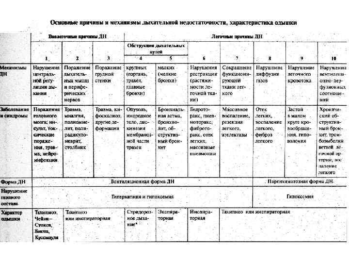 Степень тяжести ДН Степень симптомы Ра. О 2 Ра. СО 2 1(легкая) Утомляемость, одышка при нагрузке, превышающей норма обычную. 2(среднетяжёлая) Одышка при небольшой нагрузке, имеются симптомы в покое: цианоз(центральный), тахикардия. снижено Норма или понижено 3(тяжёлая) Одышка в покое, появляются акроцианоз, симптомы застоя в большом круге ( «лёгочное сердце» ) снижено повышено