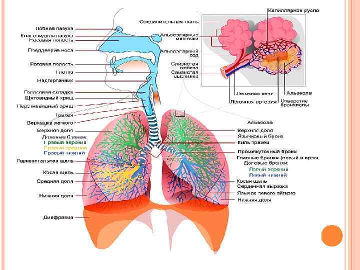 ДЫХАТЕЛЬНЫЕ ОРГАНЫ Дыхательные пути обеспечивают связи окружающей среды с главными органами дыхательной системы — лёгкими. Лёгкие (лат. pulmo, др. -греч. πνεύμων) расположены в грудной полости в окружении костей и мышц грудной клетки. В лёгких осуществляется газообмен между атмосферным воздухом, достигшим лёгочных альвеол (паренхимы лёгких), и кровью, протекающей по лёгочным капиллярам, которые обеспечивают поступление кислорода ворганиз м и удаление из него газообразных продуктов жизнедеятельности, в том числе — углекислого газа.