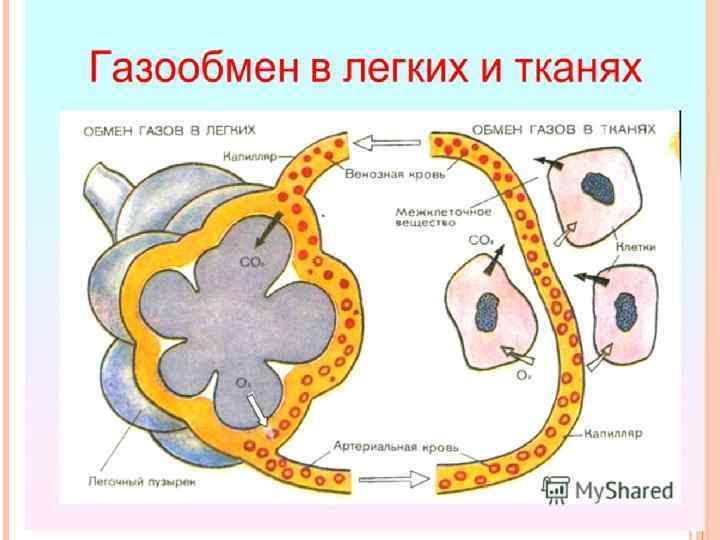 ГАЗООБМЕН Газообмен — обмен газов между организмом и внешней средой. Из окружающей среды в организм непрерывно поступает кислород, который потребляется всеми клетками, органами и тканями; из организма выделяются образующийся в нём углекислый газ и незначительное количество других газообразных продуктов метаболизма. Газообмен необходим почти для всех организмов, без него невозможен нормальный обмен веществ и энергии, а, следовательно, и сама жизнь. Кислород, поступающий в ткани, используется для окисления продуктов, образующихся в итоге длинной цепи химических превращений углеводов, жиров и белков. При этом образуются CO 2, вода, азотистые соединения и освобождается энергия, используемая для поддержания температуры тела и выполнения работы