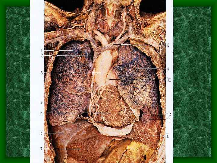Средостение • Согласно Базельской номенклатуре средостение подразделяется фронтальной плоскостью на перднее и задние. Эта плоскость проходит через трахею и корни легких. • В переднем средостении располагаются – сердце с перекардом, дуга аорты и отходящие от не сосуды, вилочковая железа, диафрагмальные нервы, перикардиально-диафрагмальные сосуды, лимфатические узлы. • В заднем средостении находятся – пищевод, грудная часть нисходящей аорты, грудной лимфатический проток, непарная и полунепарная вены, блуждающие и внутренностные нервы, симпатические стволы, лимфатические узлы.