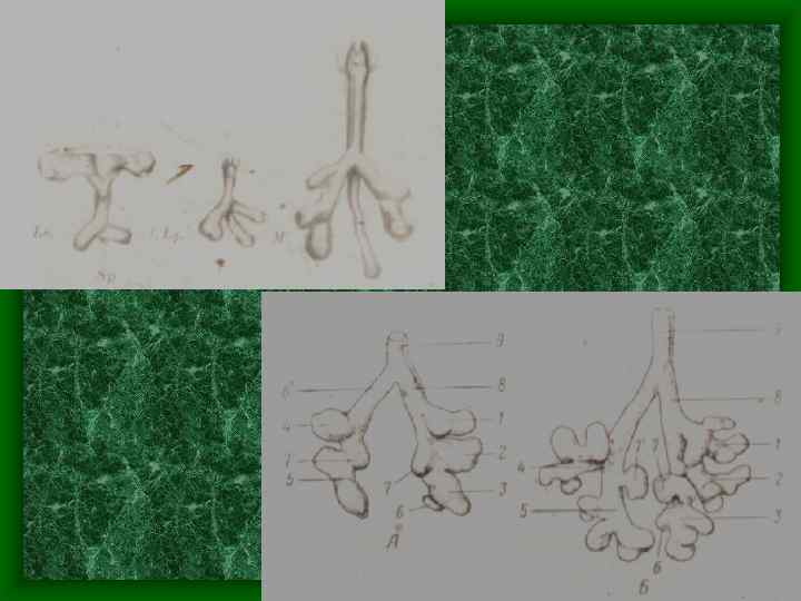 Развитие дыхательной системы • Нижний, слепо заканчивающейся конец трубки, на 4 неделе ВУР делится на асимметричные выпячивания – легочные пузырьки – будущие легкие. • На ранних стадиях развития стенка первичных легочных пузырьков, бронхов, трахеи и гортани состоит только из клеток энтодермы, затем к к ним присоединяются элементы мезенхимы. • В итоги из энтодермы развивается эпителий, выстилающий дыхательные пути и альвеолы, а из мезенхимы – хрящи, связки, мышцы, кровеносные и лимфатические сосуды.