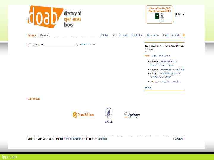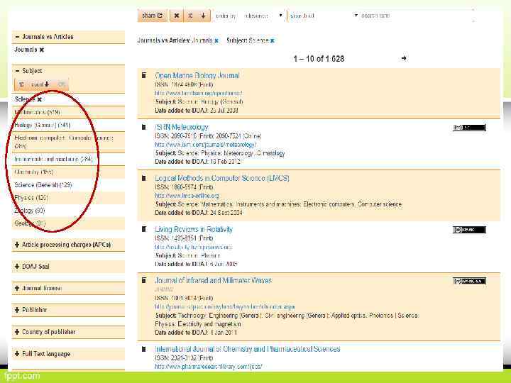 DOAJ Директорія журналів відкритого доступу http: //www. doaj. org/ 2002 р. – 33 журнали, 7 країн 2015 р. (07 жовтня) 10 600 журналів 6 479 журналів – пошук на рівні статей 2 097 523 статей 134 країн Україна – 73 журналів