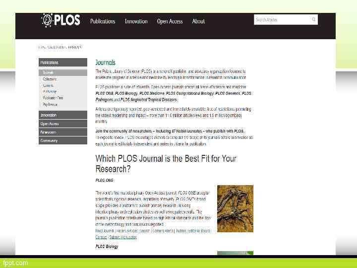PLo. S Journals - Public Library of Science Journals http: //www. plos. org/publications/journals/ Public Library of Science (Plo. S) - неприбуткова організація науковців, діяльність якої направлена на створення наукової та медичної літератури відкритого доступу 7 рецензованих журналів PLo. S Biology PLo. S Medicine PLo. S Computional Biology PLo. S Genetics PLo. S Pathogens PLo. S ONE PLo. S Neglected Tropical.