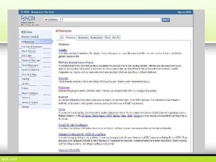 NCBI Databases http: //www. ncbi. nlm. nih. gov/guide/all/#databases Бази даних Національного центру біотехнологічної інформації США Більше 50 баз даних з біомедицини та біотехнології, окремі аспекти генетики.