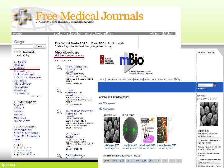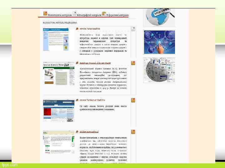 Free Medical Journals http: //freemedicaljournals. com/ 4 809 рецензованих журналів з медицини та суміжних наук Деякі з періодом ембарго – 6 -12 місяців Журнали з високим імпакт фактором – – – New England Journal of Medicine - 51, 658 BMJ (British Medical Journal) - 17, 215 Journal of Clinical Investigation - 12, 812 Brain: a Journal of Neurology - 9, 915 Clinical Infectious Diseases - 9, 374 ….