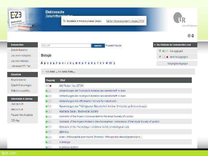 Elektronische Zeitschriftenbibliothek (EZB) http: //rzblx 1. uniregensburg. de/ezeit/ 1997 - проект бібліотек Університету Регенсбурга і Технічного університету Мюнхена 2013 – 623 учасники з усього світу Журналів усього – 83 385 Журналів відкритого доступу – 51334