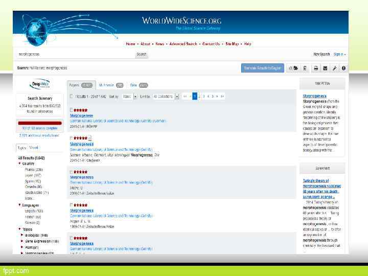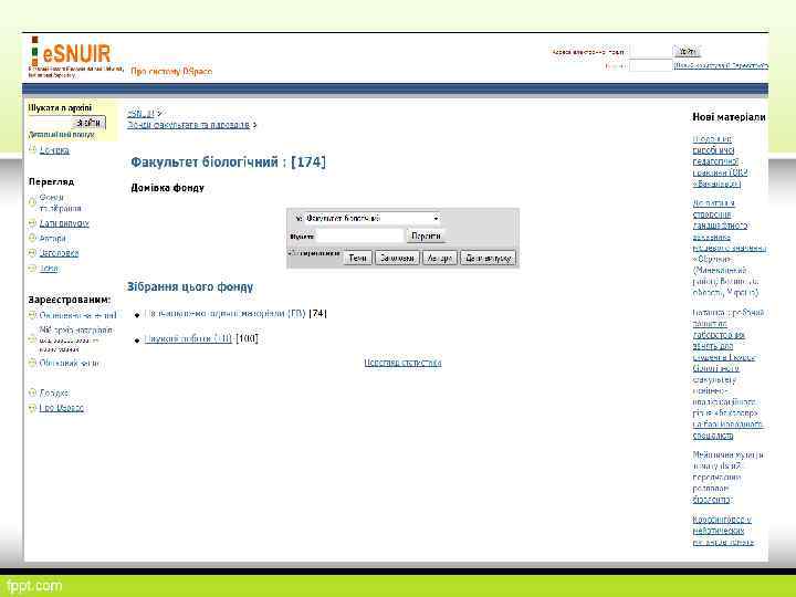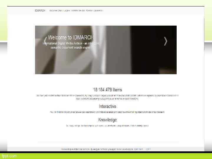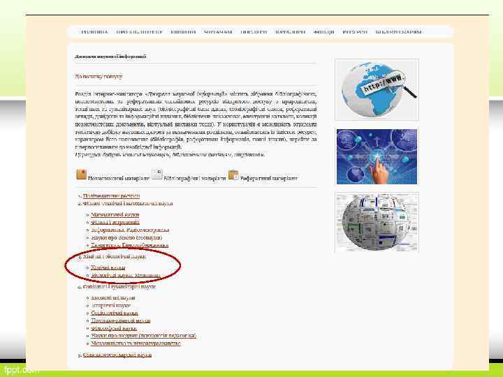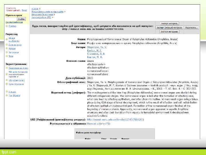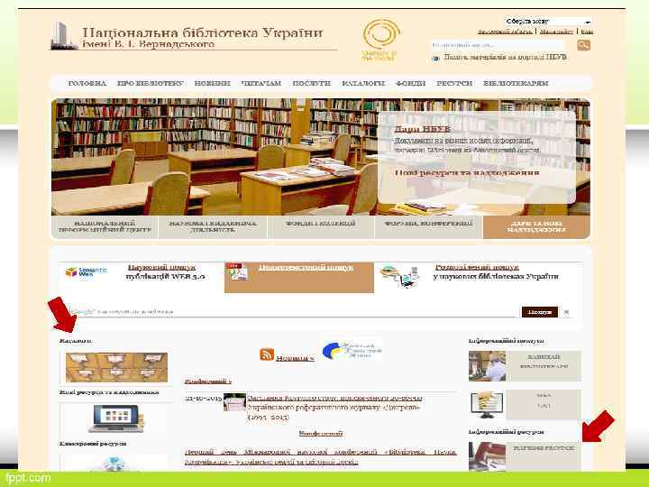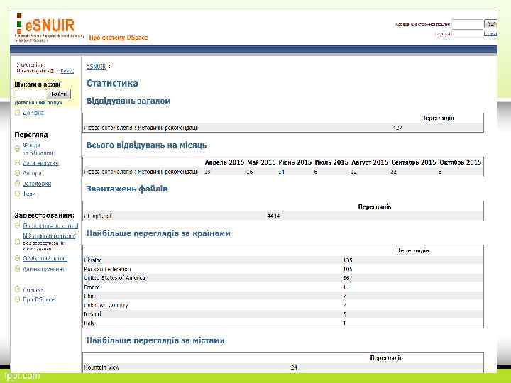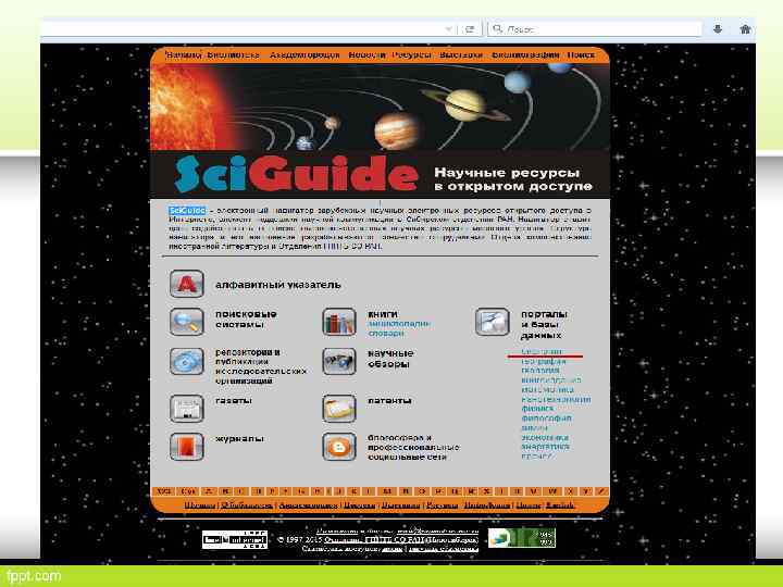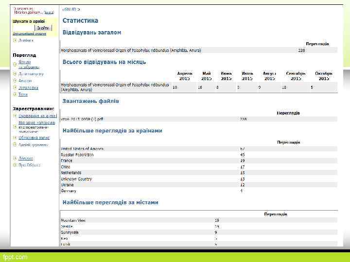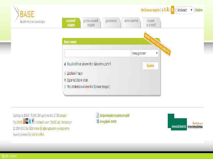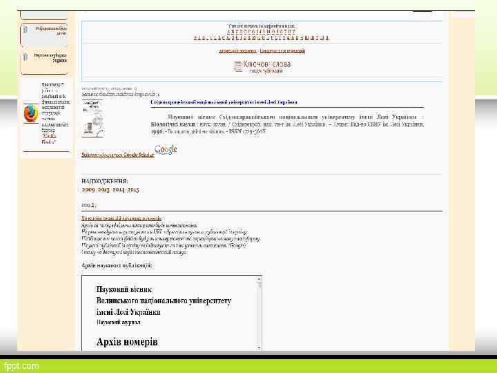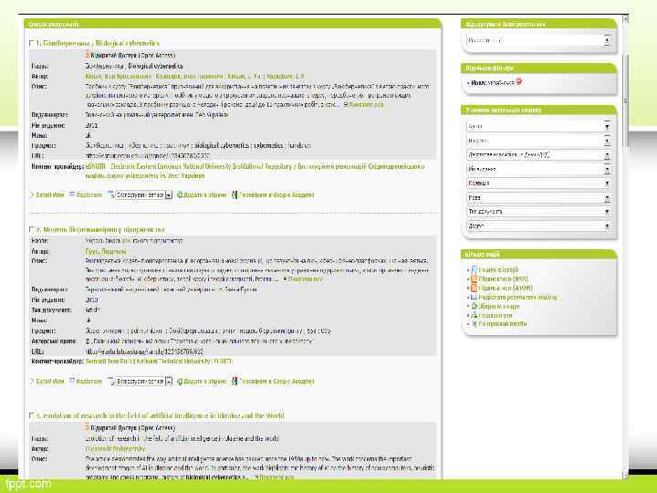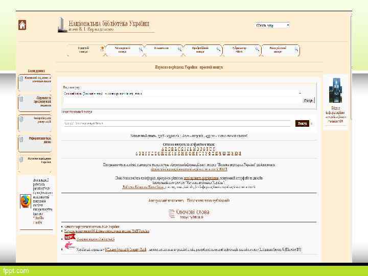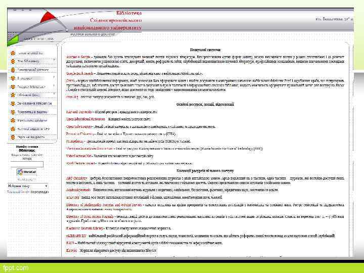 Pub. Med Central http: //www. ncbi. nlm. nih. gov/pmc/journals/ 1980 -ті - Відкритий цифровий архів журнальних статей з біомедичних і біологічних наук Національного інституту охорони здоров'я (США), розроблений Національним центром біотехнологічної інформації Національної медичної бібліотеки (США) 1 585 журналів – доступ до повних архівів 297 журналів – доступ до архівів з певного номера (за рішенням NIH) 2 767 журналів – доступ до окремих статей з гібридних журналів 3, 2 млн. статей